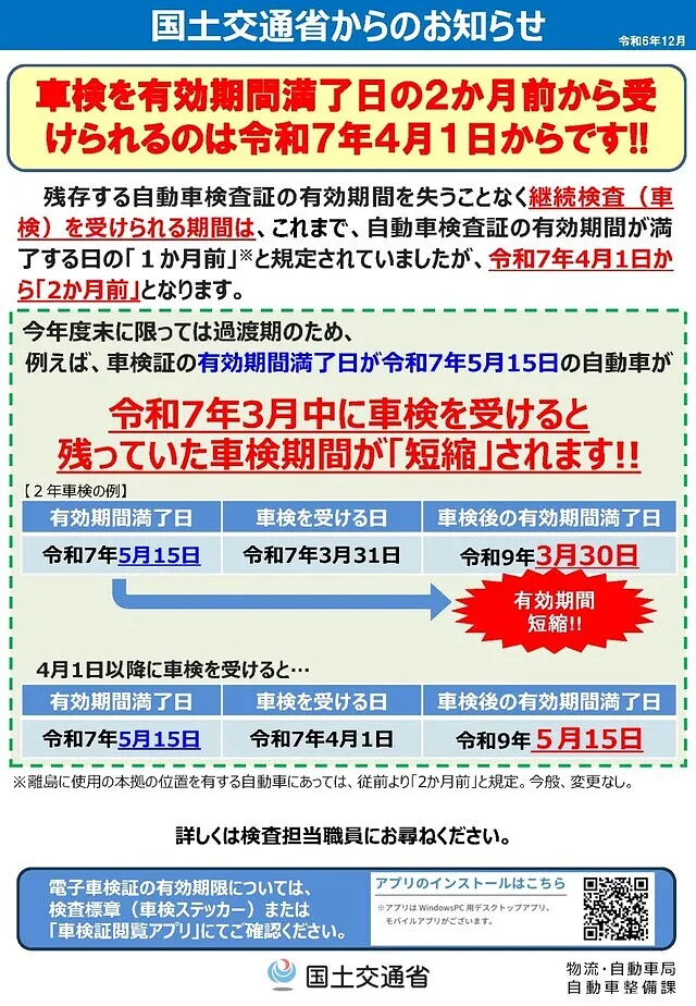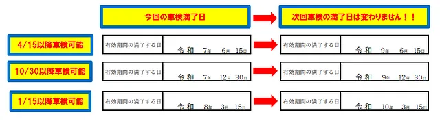 今までは車検満了日の1か月前でないと車検が受けられませんでしたが、2025年4月1日より車検満了日の2か月前から受けられるように改定されました。