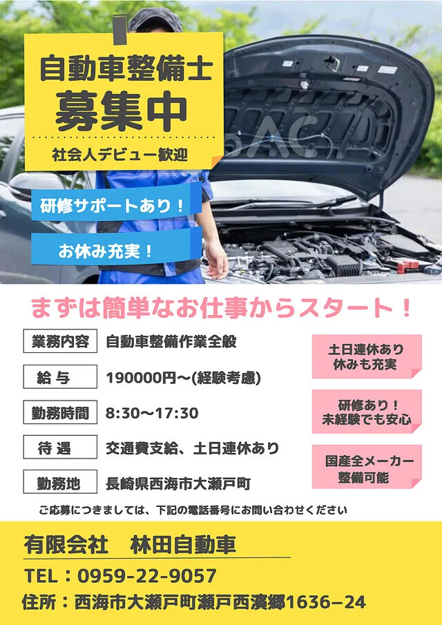 当社では、自動車整備士を募集しております。未経験者も歓迎です。車が好きな方はぜひご連絡ください。