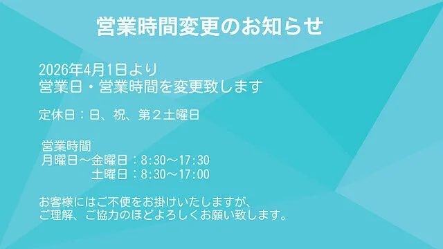 2026年4月1日より、働き方改革の一環として、営業日・営業時間を変更致します。お客様にはご不便をおかけ致しますが、ご理解・ご協力のほどよろしくお願い致します。