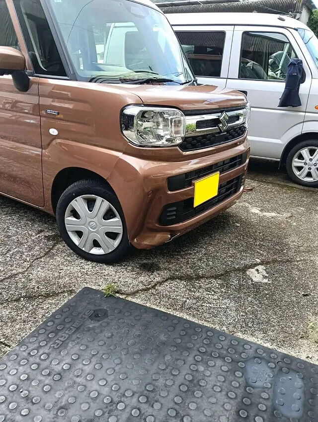 いつも弊社をご利用いただいているお客様より、今回は「動物とぶつかってバンパーが大きく凹んだ」と、スペーシアのご入庫をいただきました。