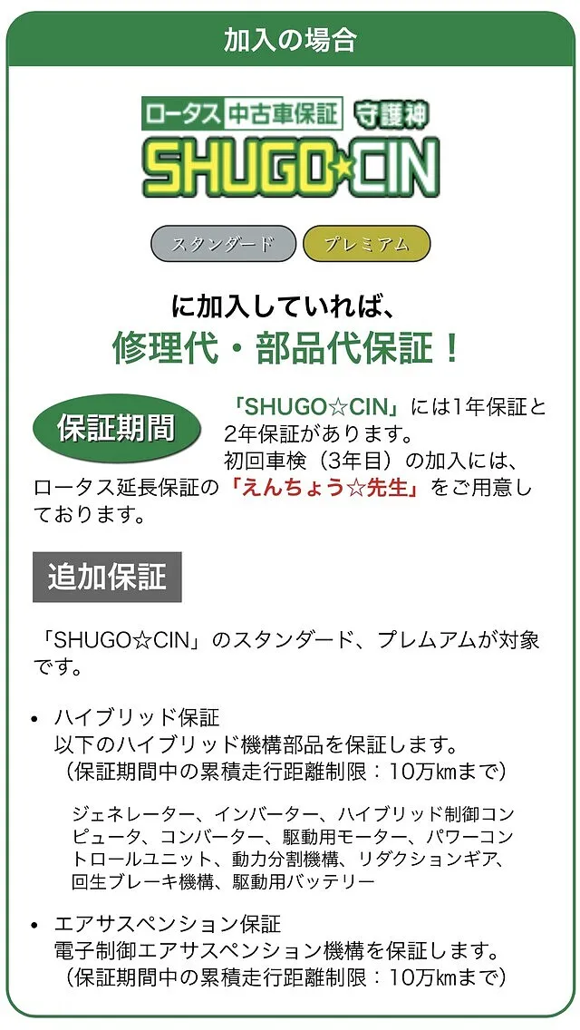 中古車保証「SHUGO☆CIN」の場合は、販売者による納車前点検(法定12ヶ月点検相当)を実施した車両、道路運送車両法に定める保安基準を満たし、法令で定める定期点検整備を常に受けている車輌が対象となります。