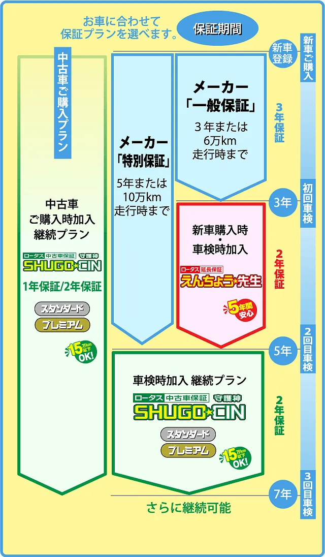 A.新車保証「えんちょう☆先生」の場合は、初回車検を販売店またはロータス整備工場で受け合格した車両が、保証の対象となります。